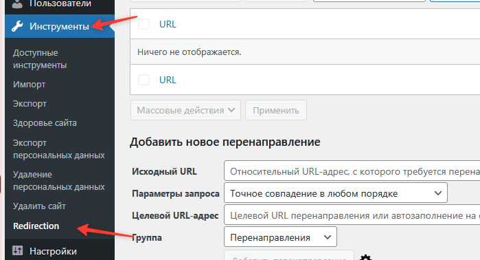 открываем в Wp панели "инструменты" "redirection" При первом входе предлагает установить плагин, делаем это.