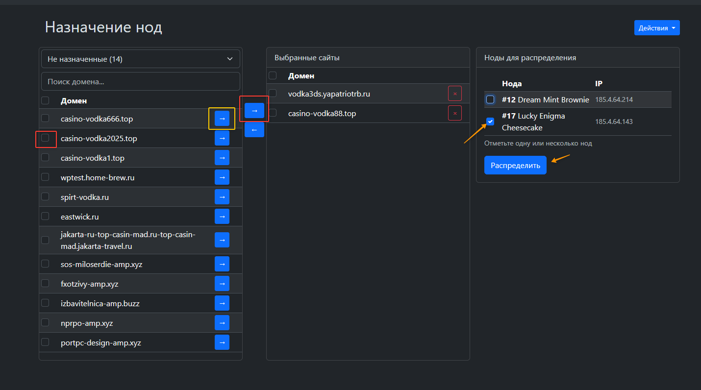Выбираем удобным способом сайты которые нужно привязать и указываем ноду или ноды на которых должны быть эти сайты. если нет конкретной задачи выбирем все ноды. нажимаем "распределить"