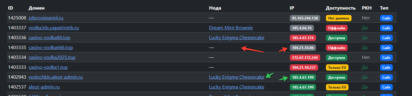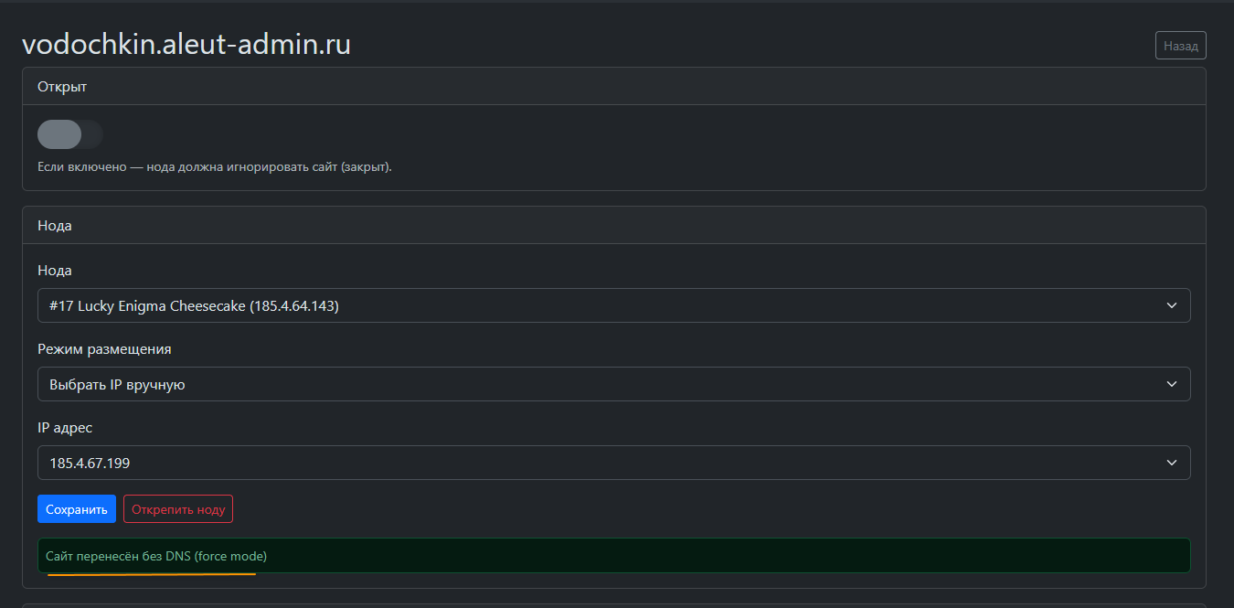 Для открываем на этой же странице домен которому не выдался айпи адрес. Выбираем ноду на которую хотим привязать домен. Рабочие ноды: